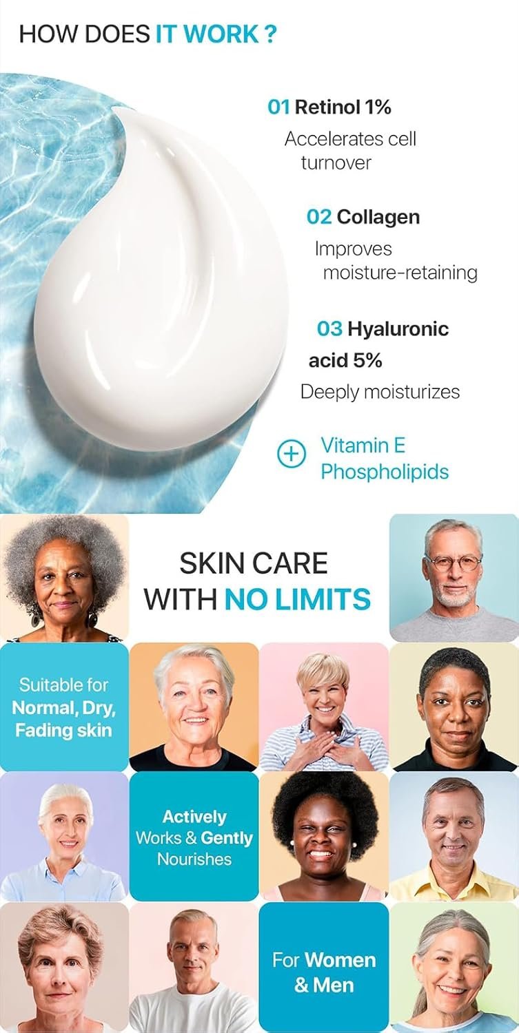 Your quest for a youthful, vibrant complexion ends here. Our Retinol Face Cream is a holistic solution crafted to revitalize and rejuvenate your skin, ensuring you look your best at any age. This luxurious facial moisturizing cream is infused with protoprotein hyaluronic acid, known for its exceptional hydrating properties, making it suitable for both men and women, day or night.